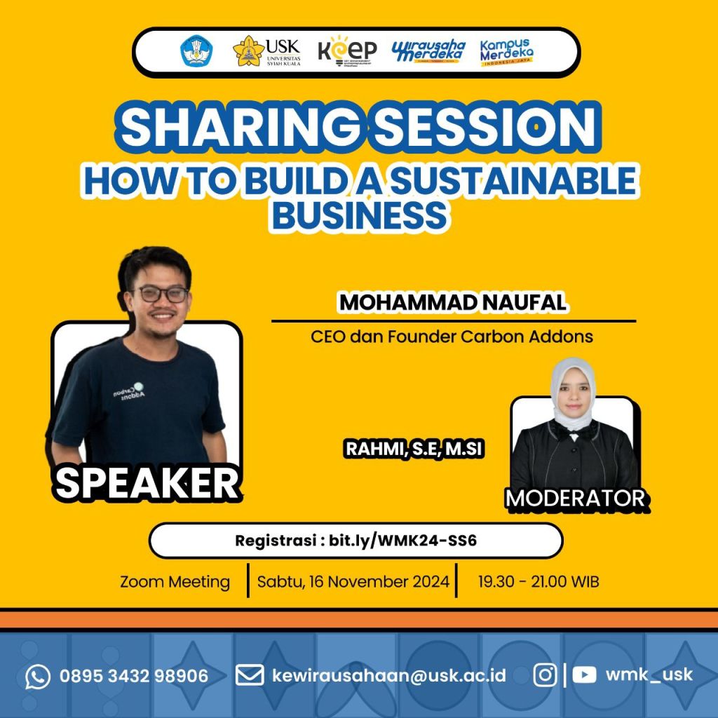Sebagai bagian dari rangkaian kegiatan Immersion Program Wirausaha Merdeka Universitas Syiah Kuala (WMK USK) 2024, Sharing Session-6 berlangsung sukses pada Sabtu, 16 November 2024, pukul 19.30-21.00 WIB melalui platform Zoom Meeting. Mengusung tema “How to Build a Sustainable Business”, sesi ini menghadirkan narasumber inspiratif, Muhammad Naufal, CEO dan Founder Carbon Addons, yang membagikan wawasan mendalam tentang pentingnya keberlanjutan dalam dunia bisnis.