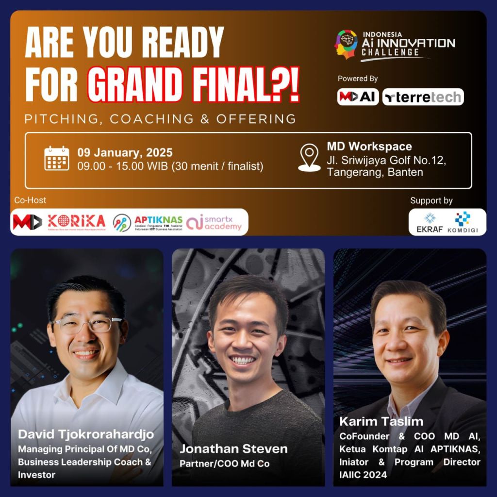 TANGERANG – Grand Final Indonesia AI Innovation Challenge (IAIIC) 2024 sukses digelar pada Kamis, 9 Januari 2025, di MD Workspace, Kabupaten Tangerang, Banten. Acara yang berlangsung dari pukul 09.00 hingga 15.00 WIB ini menjadi ajang bergengsi bagi inovator muda Indonesia untuk memamerkan solusi berbasis kecerdasan buatan (AI) kepada juri dan perwakilan investor.