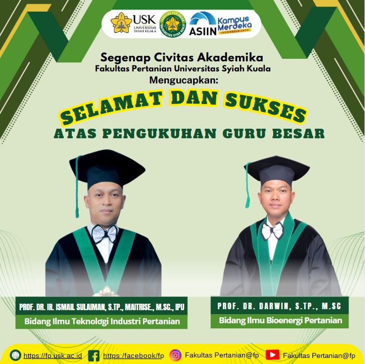 Banda Aceh, 22 April 2025 — Fakultas Pertanian Universitas Syiah Kuala (FP USK) kembali menorehkan kebanggaan dengan bertambahnya dua guru besar baru dalam jajaran akademiknya. Prof. Dr. Ir. Ismail Sulaiman, S.TP., M.Aitrise., M.Sc., IPU dikukuhkan sebagai Guru Besar dalam bidang Ilmu Teknologi Industri Pertanian, sementara Prof. Dr. Darwin, S.TP., M.Sc. meraih gelar serupa dalam bidang Ilmu Bioenergi Pertanian.