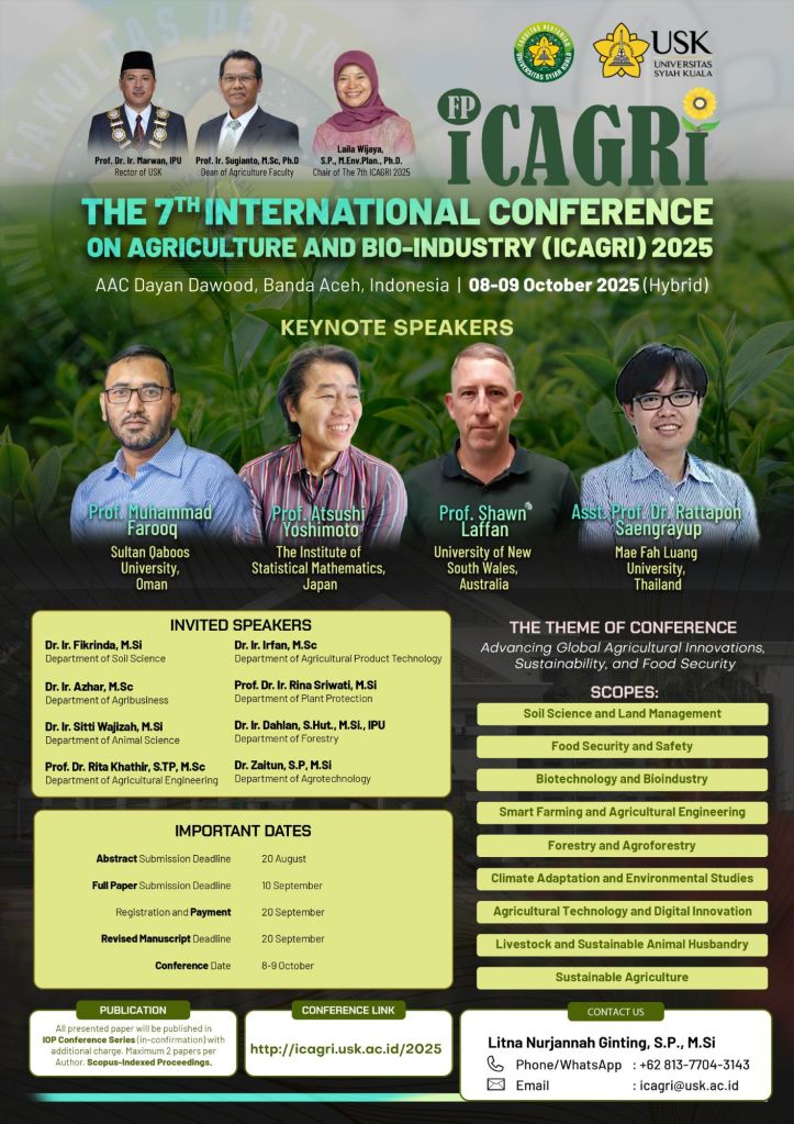 Banda Aceh, 10 Juli 2025 — Fakultas Pertanian Universitas Syiah Kuala (USK) kembali menggelar konferensi internasional bergengsi The 7th International Conference on Agriculture and Bio-Industry (ICAGRI) 2025. Kegiatan ini akan dilaksanakan secara hybrid pada 8–9 Oktober 2025 bertempat di AAC Dayan Dawood, Banda Aceh, mengangkat tema utama “Advancing Global Agricultural Innovations, Sustainability, and Food Security”.
