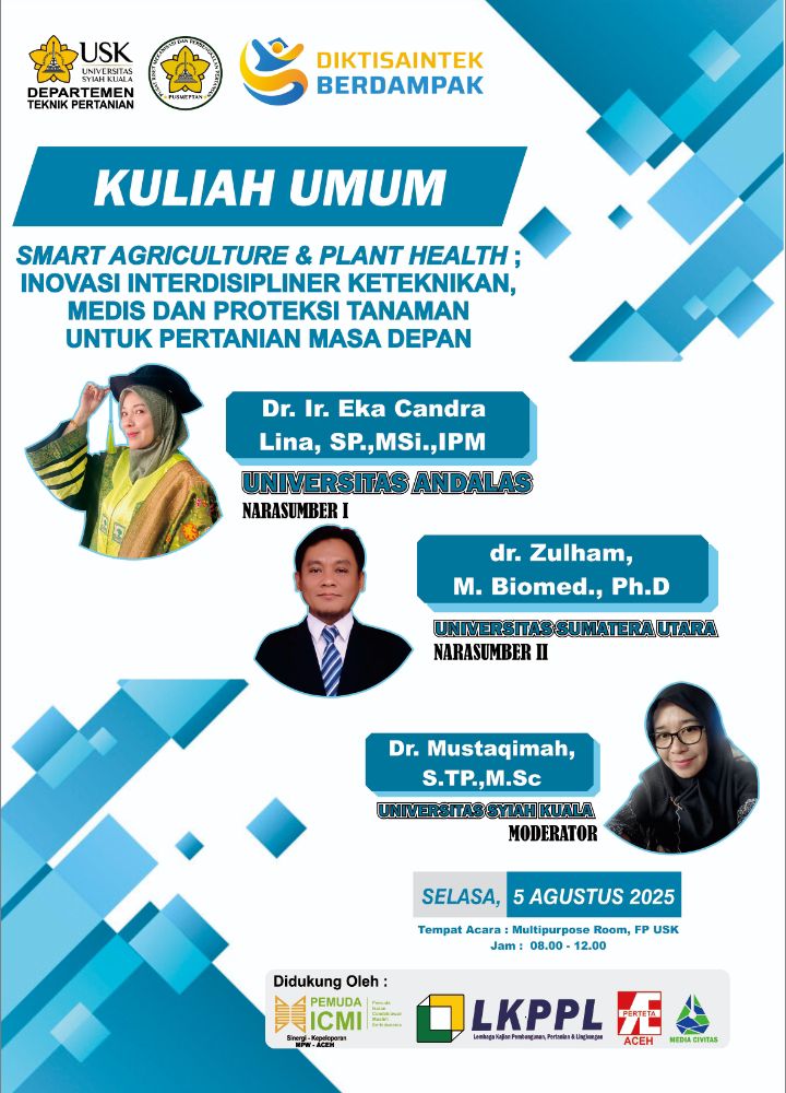 Banda Aceh, 5 Agustus 2025 — Departemen Teknik Pertanian dan PUSMEPTAN Universitas Syiah Kuala (USK) sukses menyelenggarakan Kuliah Umum bertajuk “Smart Agriculture & Plant Health: Inovasi Interdisipliner Keteknikan, Medis, dan Proteksi Tanaman untuk Pertanian Masa Depan” di Multipurpose Room Fakultas Pertanian. Kegiatan ini menghadirkan dua narasumber lintas disiplin dari universitas ternama.