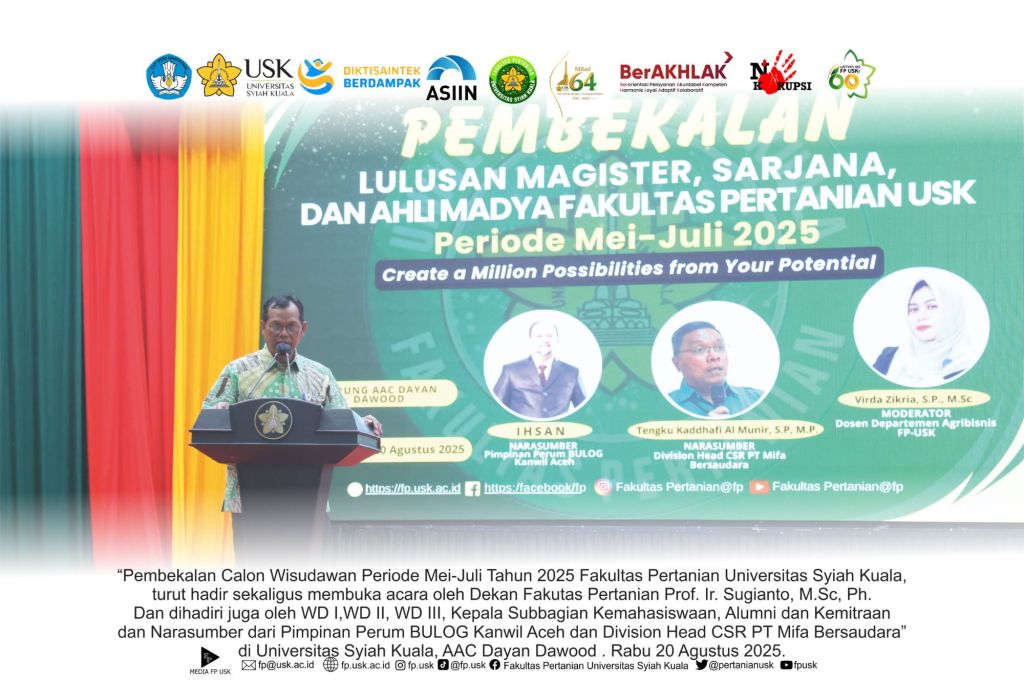 Banda Aceh, 20 Agustus 2025 – Fakultas Pertanian Universitas Syiah Kuala (USK) menyelenggarakan kegiatan Pembekalan Lulusan Magister, Sarjana, dan Ahli Madya untuk periode wisuda Mei–Juli 2025. Acara yang berlangsung di Gedung AAC Dayan Dawood USK ini mengusung tema “Create a Million Possibilities from Your Potential”, sebagai wujud komitmen fakultas dalam mempersiapkan lulusan menghadapi dunia kerja dan tantangan global.