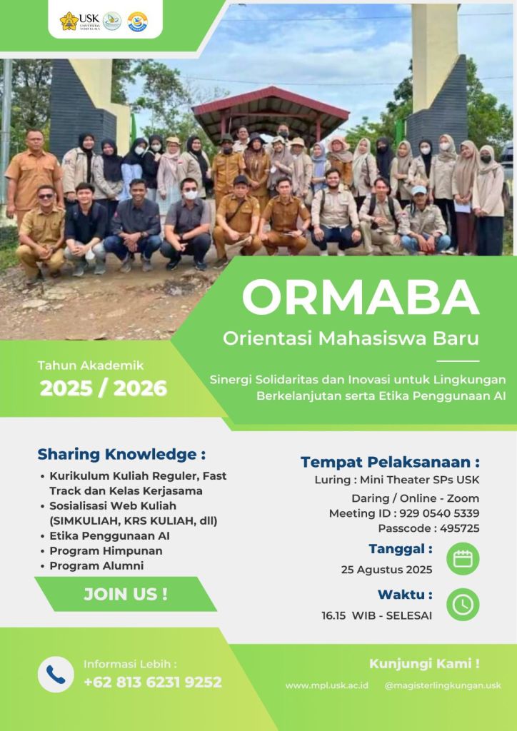 Banda Aceh, 25 Agustus 2025 – Program Studi Magister Pengelolaan Lingkungan Universitas Syiah Kuala (USK) sukses menyelenggarakan kegiatan Orientasi Mahasiswa Baru (ORMABA) pada Senin sore, 25 Agustus 2025. Acara ini berlangsung di Mini Theater Sekolah Pascasarjana USK dan juga diikuti secara daring melalui platform Zoom, sehingga dapat menjangkau seluruh mahasiswa baru dari berbagai daerah.