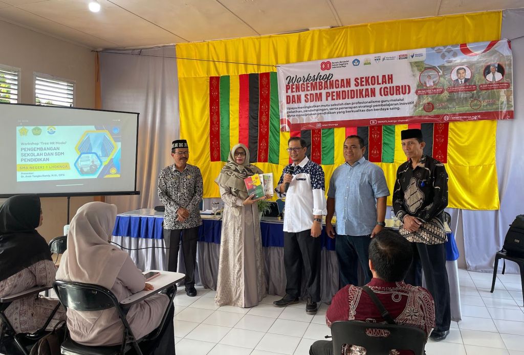 Aceh Besar, 30 Agustus 2025 – SMA Negeri 1 Lhoknga menjadi tuan rumah kegiatan edukatif bertajuk Pengembangan Sekolah dan Sumber Daya Manusia (SDM) Pendidikan yang diinisiasi oleh tim penelitian Hibah BIMA Kementerian Pendidikan, Kebudayaan, Riset, dan Teknologi (Kemendikbudristek) bersama Pascasarjana Universitas Syiah Kuala (USK) dan Universitas Ibnu Khaldun (UIK) Bogor. Kegiatan ini menghadirkan narasumber utama, Dr. Ir. Purwana Satriyo,STP, MT, IPM, Koordinator Program Studi Magister Pengelolaan Sumber Daya Alam (MPSDA) Pascasarjana USK.