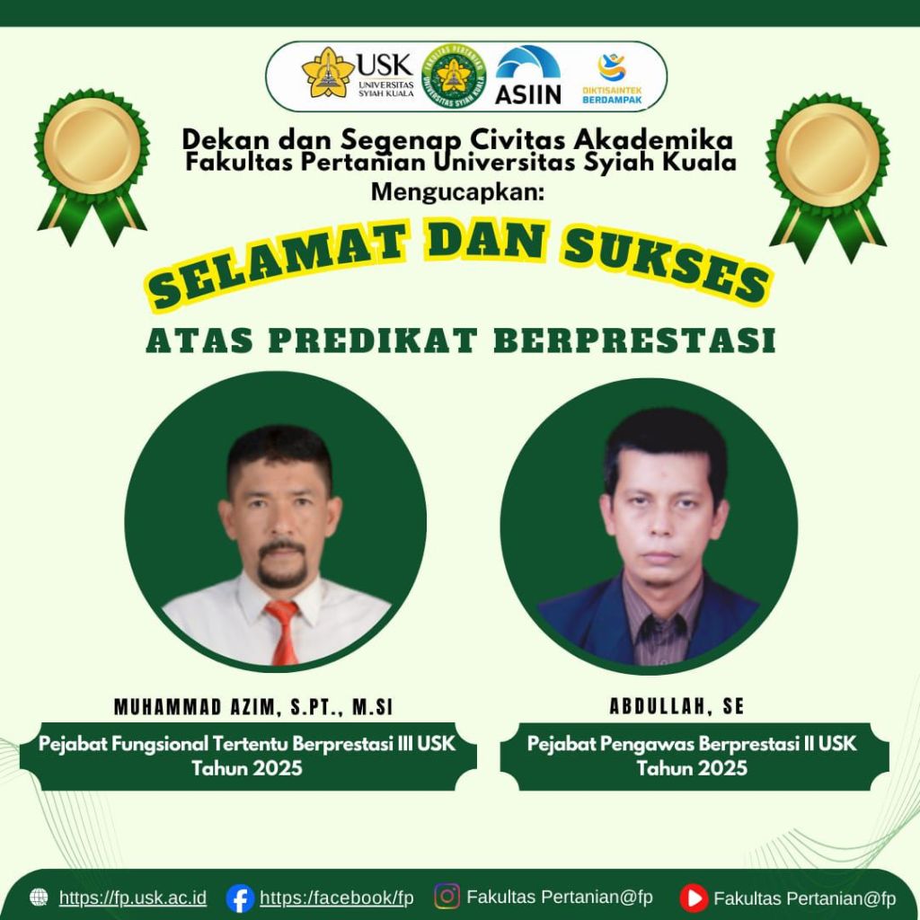 Dua ASN dari Fakultas Pertanian USK turut mengharumkan nama fakultas dengan meraih predikat prestisius. Abdullah, SE berhasil meraih penghargaan sebagai Pejabat Pengawas Berprestasi II USK Tahun 2025, sementara Muhammad Azim, S.Pt., M.Si. dinobatkan sebagai Pejabat Fungsional Tertentu Berprestasi III USK Tahun 2025.