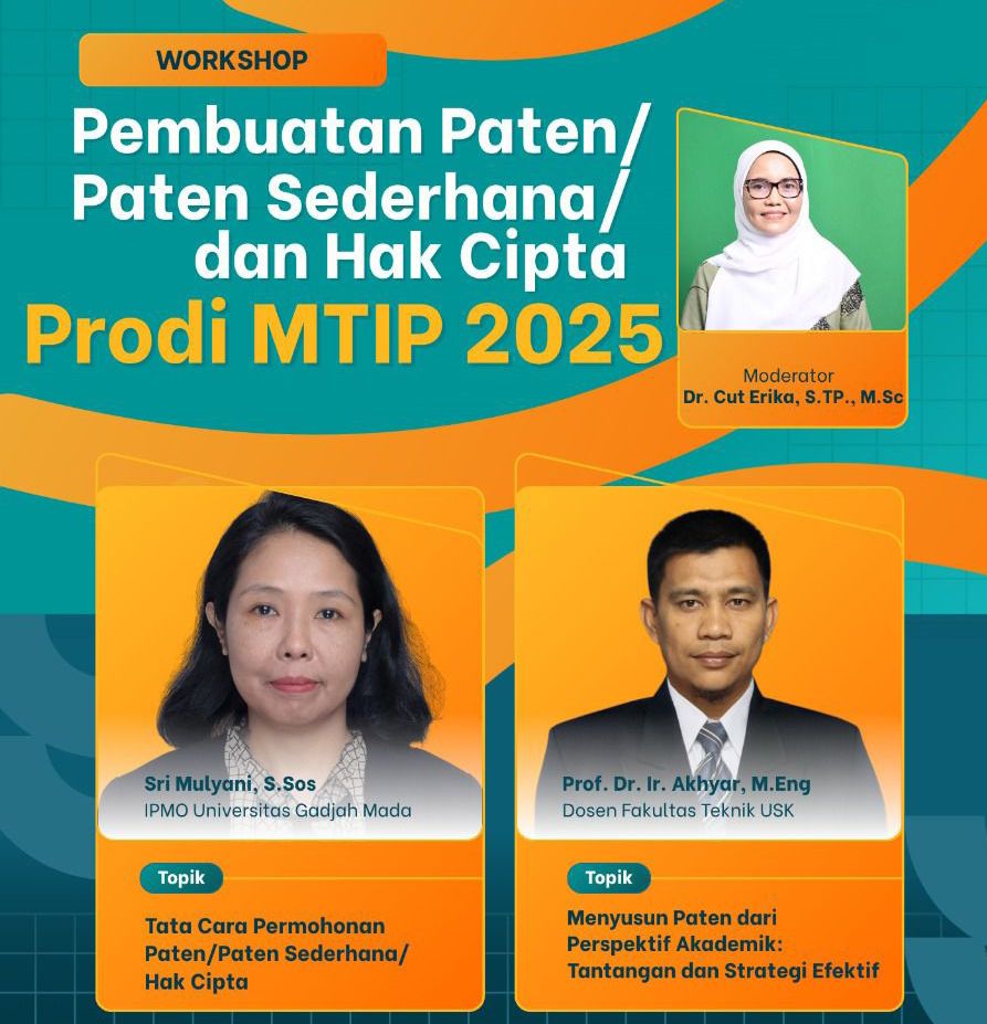 Banda Aceh, 28 Oktober 2025 — Program Studi Magister Teknologi Industri Pertanian (MTIP) Fakultas Pertanian Universitas Syiah Kuala (USK) menyelenggarakan Workshop Pembuatan Paten, Paten Sederhana, dan Hak Cipta di ruang Multi Purpose Room Gedung D Fakultas Pertanian. Kegiatan ini menjadi bagian penting dari agenda akademik yang bertujuan menumbuhkan budaya inovasi dan meningkatkan jumlah karya ilmiah yang berujung pada perlindungan Hak Kekayaan Intelektual (HKI).