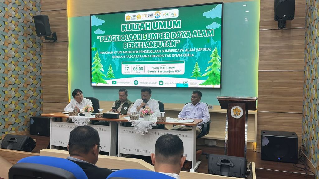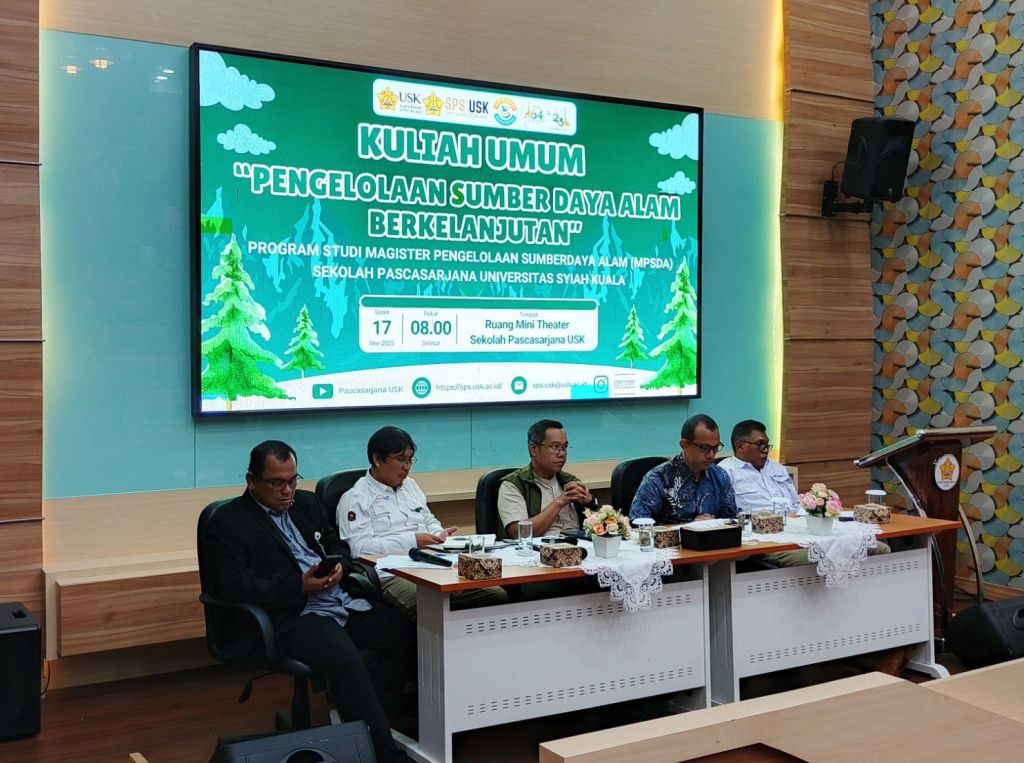 BANDA ACEH 17 November 2025 – Sekolah Pascasarjana Universitas Syiah Kuala (SPS USK) menyelenggarakan Kuliah Umum bertema “Pengelolaan Sumber Daya Alam Berkelanjutan” pada Senin, 17 November 2025, bertempat di Mini Theater SPS USK. Kegiatan ini berlangsung mulai pukul 08.00 WIB dan menghadirkan empat pemateri dari berbagai institusi strategis di Aceh dan nasional. Kegiatan ini merupakan bagian dari Milad ke 23 SPS USK. Hadir dalam kegiatan ini, Direktur Sekolah Pascasarjana, Prof. Dr. Hizir untuk membuka acara kuliah umum, dan hadir pula Wakil Direktur Akademik Sekolah Pascasarjana, Dr. Mhd. Ikhsan Sulaiman, S.TP., M.Sc., IPU, ASEAN. Eng