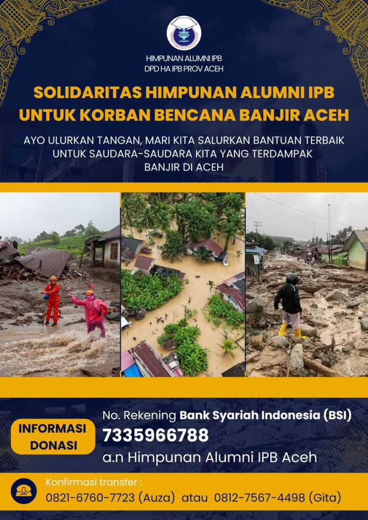Melalui rilis resmi, HA IPB Aceh mengumumkan pembukaan dukungan moril dan materil untuk membantu saudara-saudara yang saat ini tengah berjuang menghadapi masa sulit. Para alumni IPB dari seluruh angkatan dan seluruh daerah diajak untuk ikut memberikan kontribusi nyata dalam upaya pemulihan kondisi masyarakat yang terdampak banjir.
