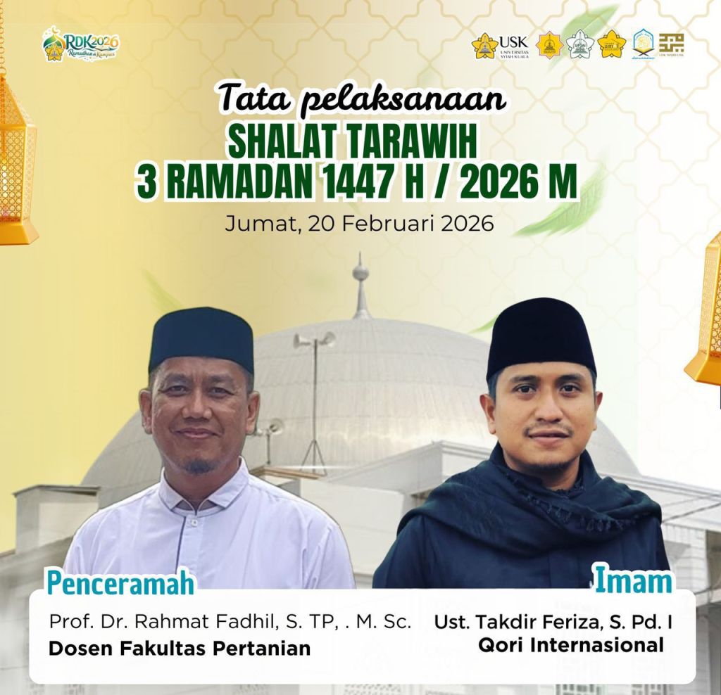BANDA ACEH 21 Februari 2026 – Malam ketiga Ramadhan 1447 H menghadirkan suasana yang begitu khidmat di Masjid Jamik Universitas Syiah Kuala. Ratusan jamaah yang terdiri atas mahasiswa, dosen, serta masyarakat umum memadati ruang utama masjid untuk menunaikan shalat tarawih berjamaah. Sebelum shalat dimulai, jamaah terlebih dahulu mendapatkan siraman ruhani melalui tausiyah yang disampaikan oleh Prof. Dr. Ir. Rahmat Fadhil, S.TP., M.Sc.