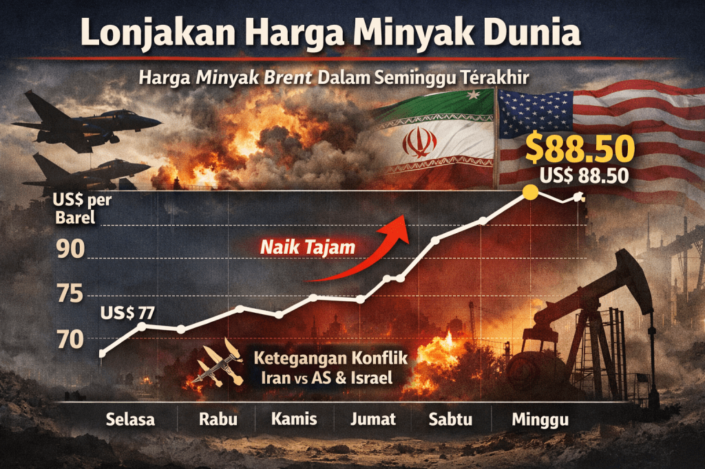 Eskalasi perang antara AS, Israel, dan Iran telah memicu lonjakan harga minyak dunia akibat ancaman gangguan pasokan melalui rute strategis Selat Hormuz. Lonjakan ini berdampak pada pasar energi global dan menimbulkan kekhawatiran kenaikan harga BBM di Indonesia, tekanan inflasi, serta beban fiskal tambahan. Pemerintah dan pelaku pasar bersiap menghadapi ketidakpastian yang berlanjut terkait konflik ini.