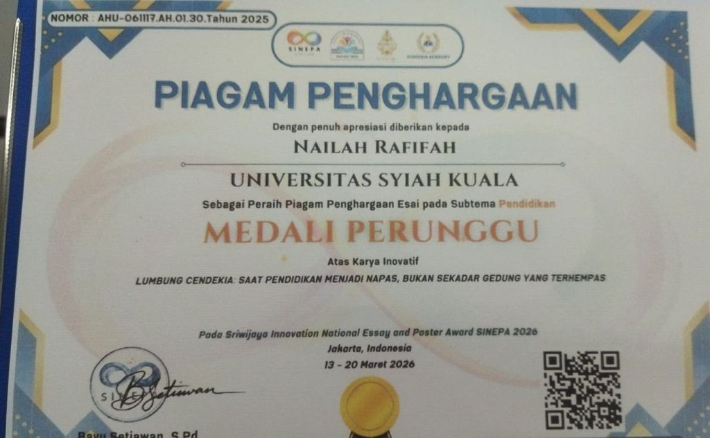 Banda Aceh 10 April 2026 — Prestasi membanggakan kembali diraih oleh mahasiswa Fakultas Pertanian Universitas Syiah Kuala (USK). Nailah Rafifah, mahasiswa Departemen Agribisnis, berhasil meraih medali perunggu pada subtema pendidikan dalam ajang Sriwijaya Innovation National Essay and Poster Award (SINEPA) 2026.