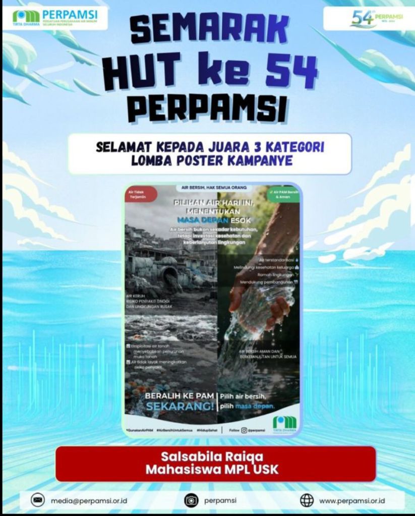 Salsabila Raiqa, mahasiswa Magister Pengelolaan Lingkungan Universitas Syiah Kuala berhasil meraih Juara 3 dalam lomba poster yang diselenggarakan dalam rangka memperingati Hari Ulang Tahun (HUT) ke-54 Persatuan Perusahaan Air Minum Seluruh Indonesia (PERPAMSI). Karya yang diusung berjudul “Pilihan Air Hari Ini Menentukan Masa Depan Esok”, yang mengangkat pentingnya akses terhadap air bersih yang aman dan layak.