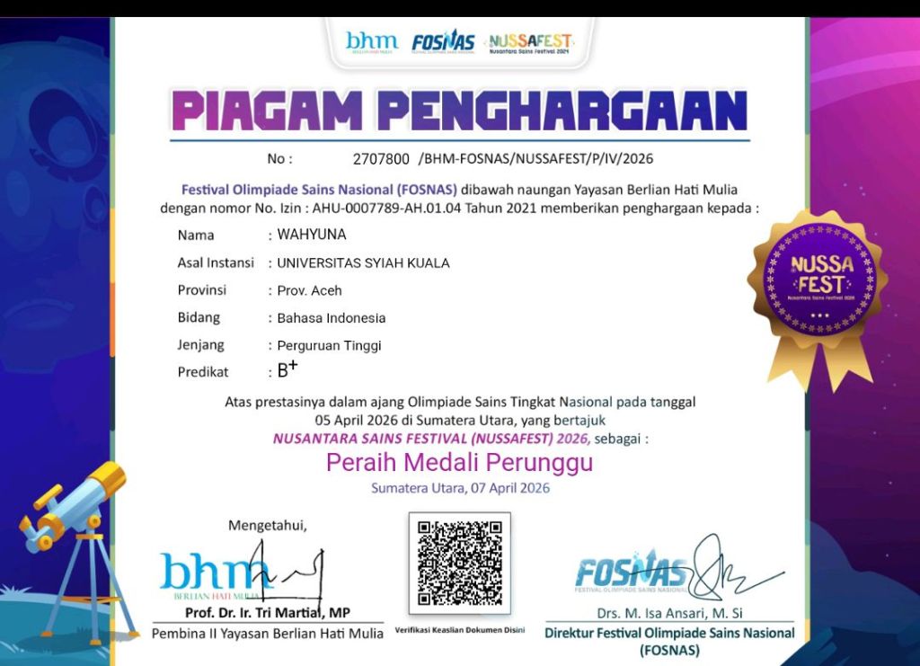 Banda Aceh 20 April 2026 – Prestasi membanggakan kembali ditorehkan oleh mahasiswa Fakultas Pertanian Universitas Syiah Kuala (USK). Wahyuna, mahasiswa Program Studi D3 Manajemen Agribisnis, berhasil meraih medali perunggu pada ajang Nusantara Sains Festival (NUSAFEST) 2026 di bidang Bahasa Indonesia.