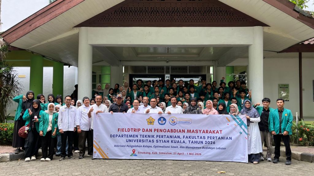 Banda Aceh 27 April 2026 — Mahasiswa Program Studi Teknik Pertanian, Fakultas Pertanian, Universitas Syiah Kuala (USK) melaksanakan kegiatan “Field Trip” ke Kabupaten Simeulue, Provinsi Aceh, yang berlangsung pada 27 April hingga 1 Mei 2026. Kegiatan ini secara resmi dilepas oleh Dekan Fakultas Pertanian, Prof. Ir. Sugianto, M.Sc., Ph.D., didampingi jajaran dekanan, serta turut dihadiri Prof. Dr. Ir. Hasanuddin, M.S. dan Dr. Ir. Syahrul, M.Sc. masing-masing adalah Ketua dan Sekretaris Senat Fakultas Pertanian.
